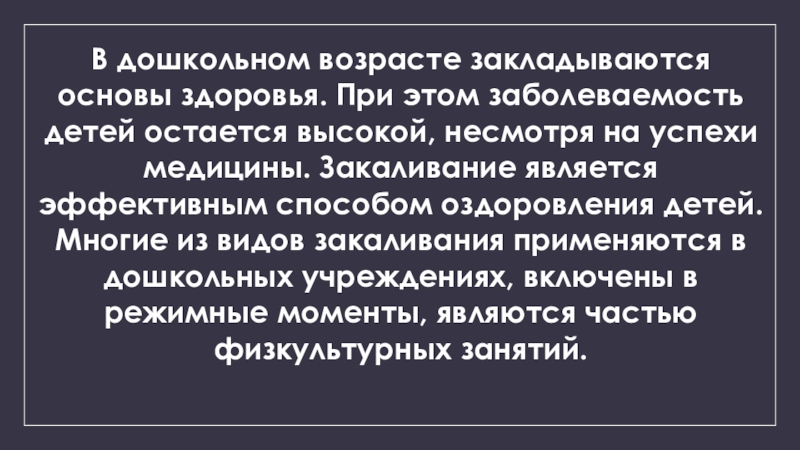 высокой, несмотря на успехи медицины. Закаливание является эффективным способом оздоровления детей. Многие из видов закаливания применяются в дошкольных учреждениях, включены в режимные моменты, являются частью физкультурных занятий.