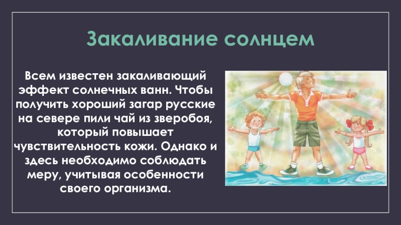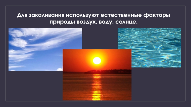 Слайд 5Для закаливания используют естественные факторы природы воздух, воду, солнце.