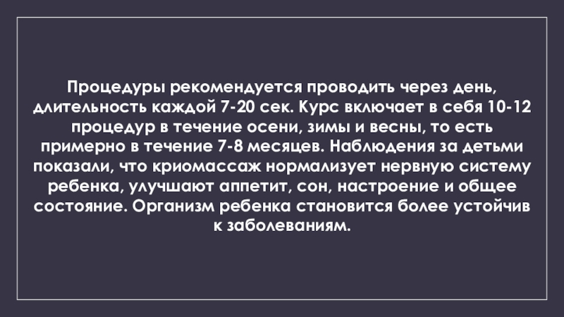 в себя 10-12 процедур в течение осени, зимы и весны, то есть примерно в течение 7-8 месяцев. Наблюдения за детьми показали, что криомассаж нормализует нервную систему ребенка, улучшают аппетит, сон, настроение и общее состояние. Организм ребенка становится более устойчив к заболеваниям.