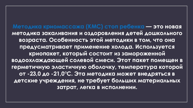 Слайд 18Методика криомассажа (КМС) стоп ребенка — это новая методика закаливания и