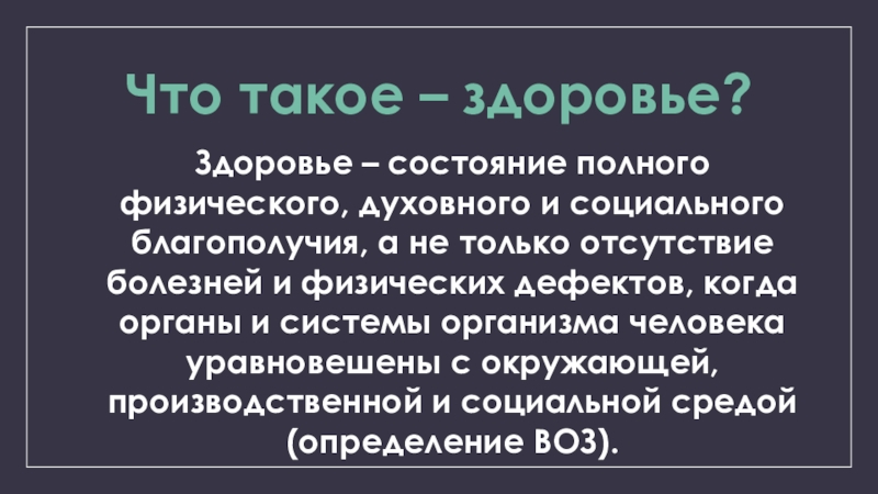 благополучия, а не только отсутствие болезней и физических дефектов, когда органы и системы организма человека уравновешены с окружающей, производственной и социальной средой (определение ВОЗ).
