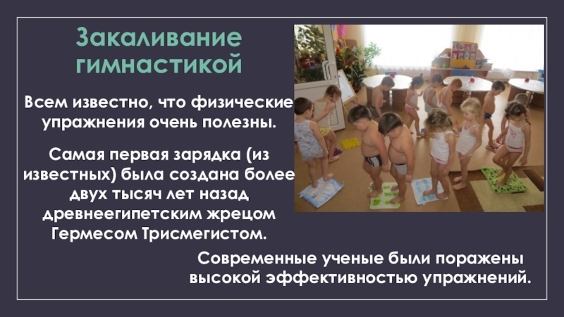 из системы мероприятий, включающих элементы закаливания в повседневной жизни и специальные мероприятия: воздушные ванны, водные процедуры, правильно организованную прогулку, физические упражнения, проводимые в легкой спортивной форме одежды в помещении и на открытом воздухе.