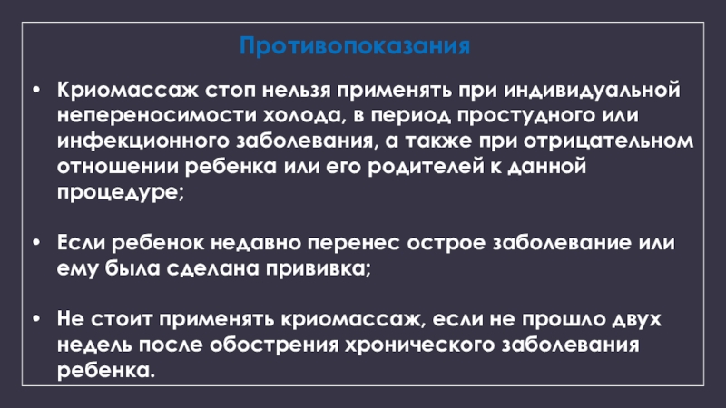 Слайд 20Криомассаж стоп нельзя применять при индивидуальной непереносимости холода, в период простудного