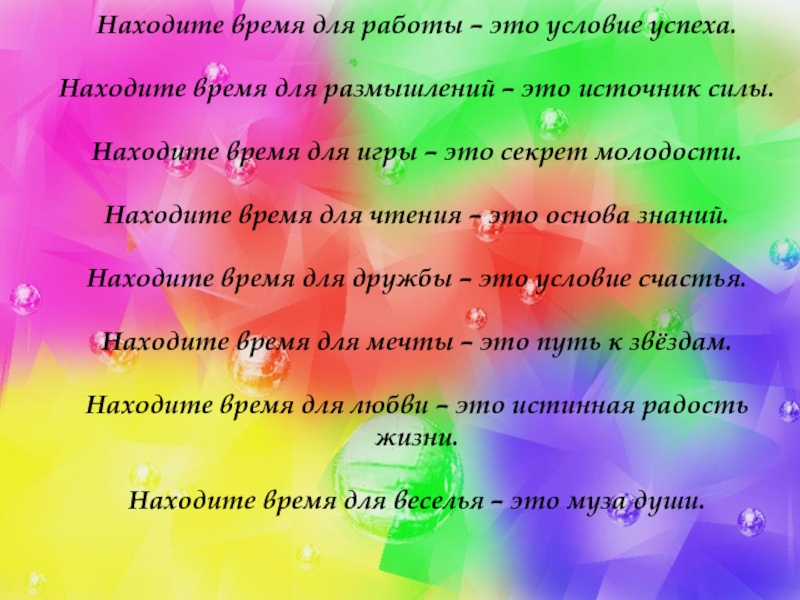 – это источник силы. Находите время для игры – это секрет молодости. Находите время для чтения – это основа знаний. Находите время для дружбы – это условие счастья. Находите время для мечты – это путь к звёздам. Находите время для любви – это истинная радость жизни. Находите время для веселья – это муза души.