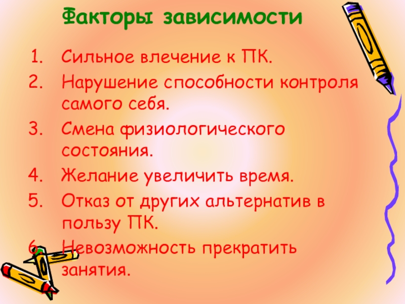 Факторы зависимостиСильное влечение к ПК.Нарушение способности контроля самого себя.Смена физиологического состояния.Желание увеличить время.Отказ от других альтернатив в