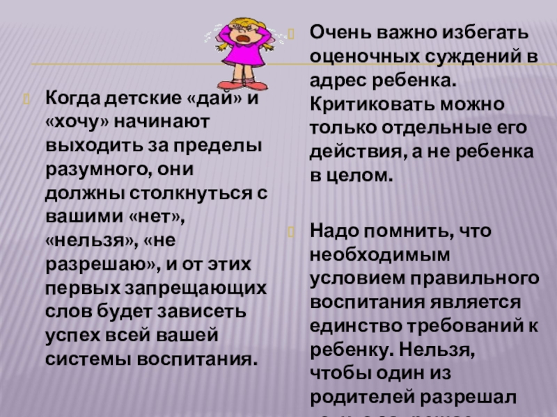 Очень важно избегать оценочных суждений в адрес ребенка. Критиковать можно только отдельные его действия, а не ребенка в целом.
