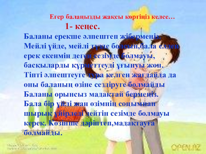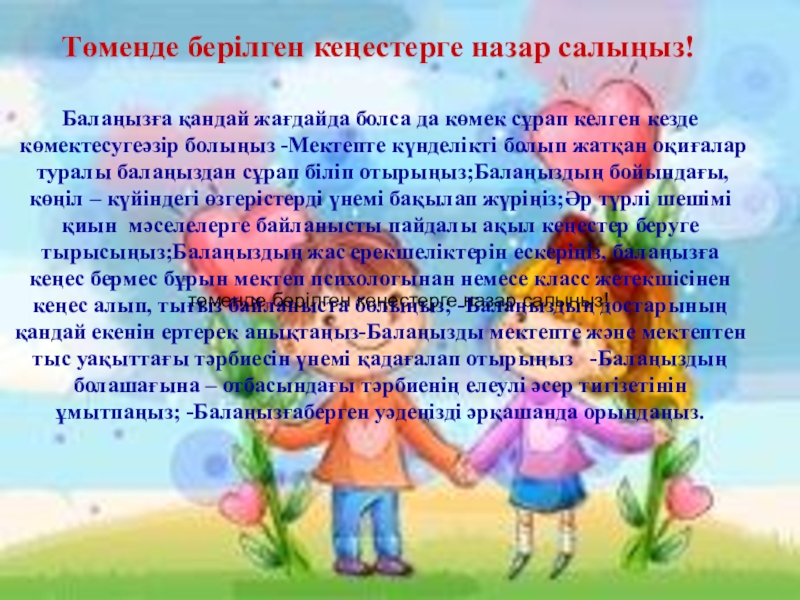 кеңес бермес бұрын мектеп психологынан немесе класс жетекшісінен кеңес алып, тығыз байланыста болыңыз; -Балаңыздың достарының қандай екенін ертерек анықтаңыз-Балаңызды мектепте және мектептен тыс уақыттағы тәрбиесін үнемі қадағалап отырыңыз -Балаңыздың болашағына – отбасындағы тәрбиенің елеулі әсер тигізетінін ұмытпаңыз; -Балаңызғаберген уәдеңізді әрқашанда орындаңыз.