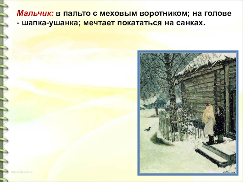 Слайд 27Мальчик: в пальто с меховым воротником; на голове - шапка-ушанка; мечтает