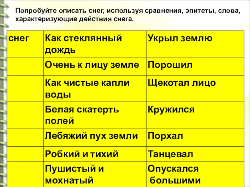 Слайд 20Попробуйте описать снег, используя сравнения, эпитеты, слова, характеризующие действия снега.