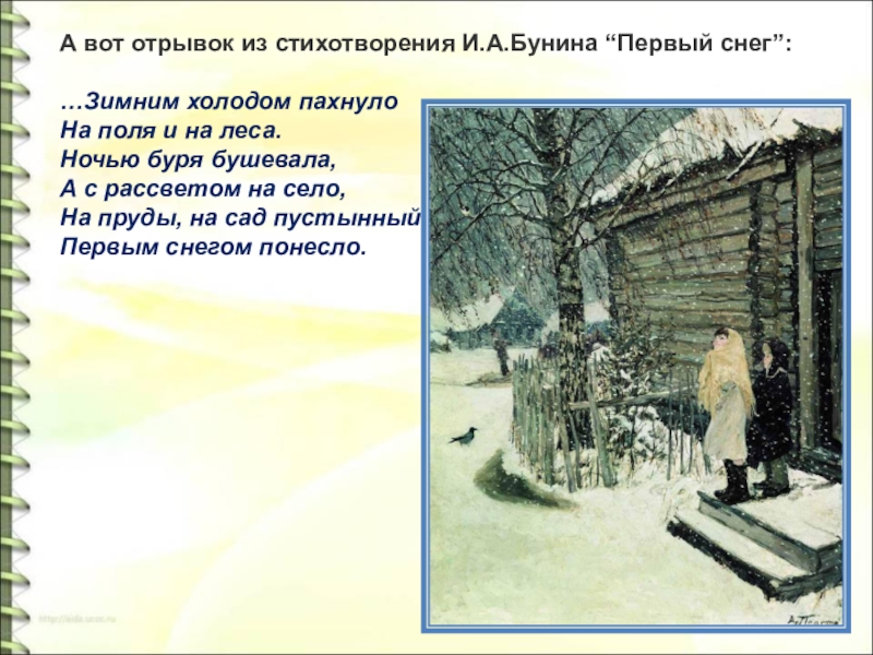 Слайд 14А вот отрывок из стихотворения И.А.Бунина “Первый снег”: