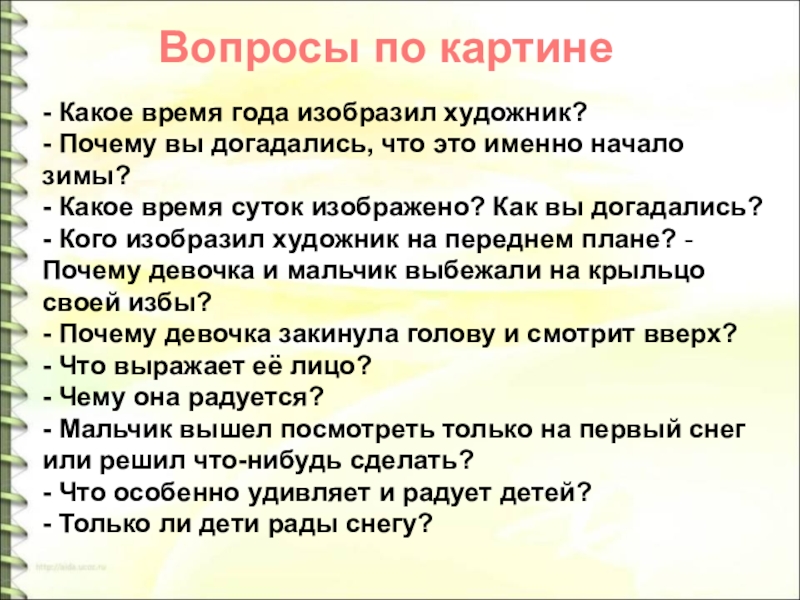 Проснулись утром дети, выглянули в окно и удивились: за одну ночь все вокруг побелело. Выбежала на крыльцо девочка с младшим братом. Девочка не успела даже одеться: накинула на голову большой теплый платок и в одном легком платье выскочила из избы. Ноги успела сунуть в валенки. Она, закинув голову, смотрит на падающий снежок. Восторг и удивление выражает ее лицо. Глаза весело улыбаются, блестят от радости. Ее брат оделся потеплее: в черный пиджак, на голову нахлобучил шапку. Мальчик смотрит на побелевшую улицу, на белые крыши деревенских изб. Он тоже доволен первым снегом. Рядом, в палисаднике, растет старая береза. Она стала пушистой и красивой. Тут же растет мелкий куст. Снег засыпал его нижние ветки и прижал к земле. За углом избы видна часть деревенской улицы. Вдалеке человек с санями, он тоже остановился полюбоваться снежными укрытиями. Лишь у забора осталась небольшая проталина, рядом с которой ходила серо-черная ворона, тоже радуясь снегу.