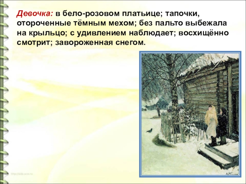 Слайд 26Девочка: в бело-розовом платьице; тапочки, отороченные тёмным мехом; без пальто выбежала