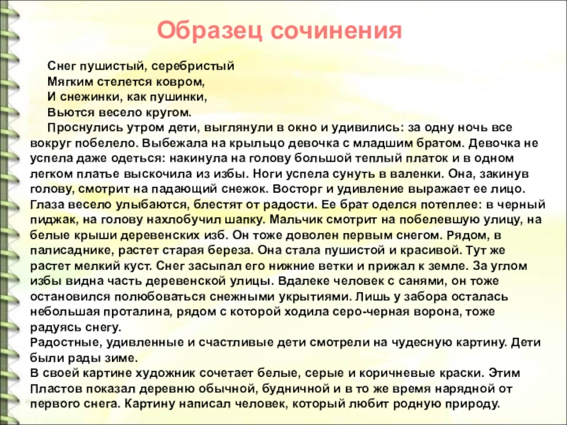 Радостные и счастливые брат и сестра выбежали на крыльцо. Мальчик надел валенки, шапку-ушанку, шубу и собрался погулять. Он давно с нетерпением ожидал прихода зимы. Сестра же выбежала в платье, успела накинуть на голову только платок. На ее лице радостная улыбка. Она подняла голову и долго любовалась пушистым и мохнатым снегом, устилающим землю. Береза, вчера еще голая и прозрачная, сейчас стояла пушистая и красивая. Ворона спокойно и важно шагает по снегу. Она ищет себе корм. Как волшебно изменилась природа от первого снега!