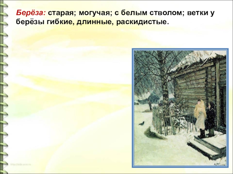 Слайд 28Берёза: старая; могучая; с белым стволом; ветки у берёзы гибкие, длинные,