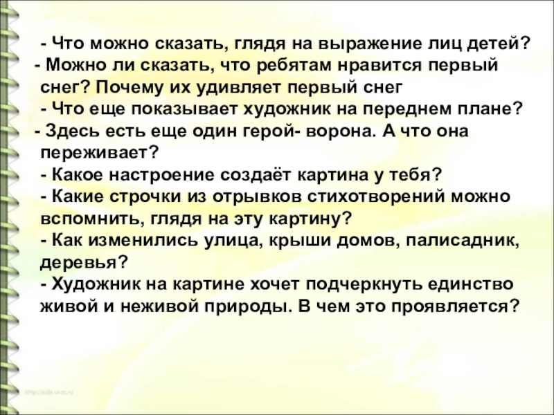 Раннее утро. В комнате необыкновенно светло. Дети проснулись и увидели, что за окном все белым-бело. Оказывается, ночью выпал первый снег. Он покрыл тонким слоем и дома, и заборы, и землю.