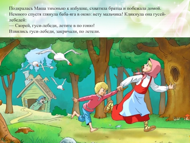 Слайд 11А гуси-лебеди увидали её — воротились, летят навстречу. Подбежала Маша к