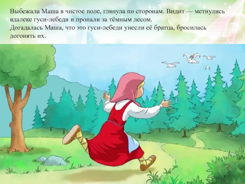 Слайд 4Выбежала Маша в чистое поле, глянула по сторонам. Видит — метнулись