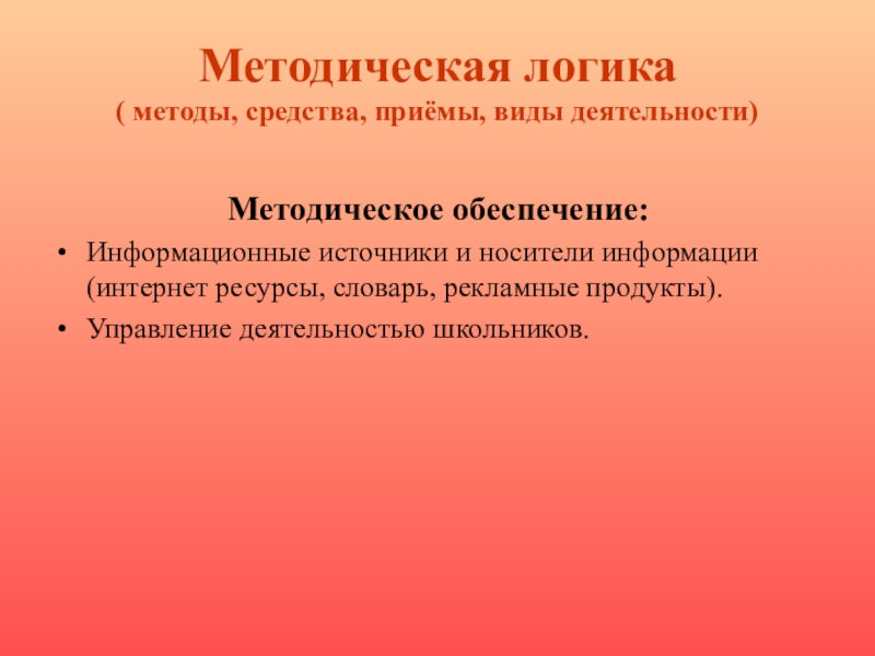 Методическая логика ( методы, средства, приёмы, виды деятельности)Методическое обеспечение:Информационные источники и носители информации (интернет ресурсы, словарь, рекламные