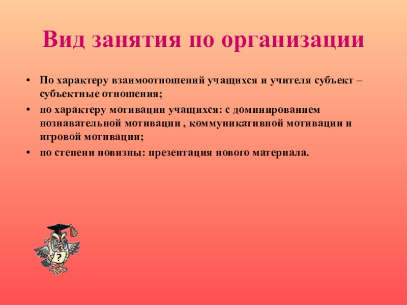 Вид занятия по организацииПо характеру взаимоотношений учащихся и учителя субъект – субъектные отношения;по характеру мотивации учащихся: с