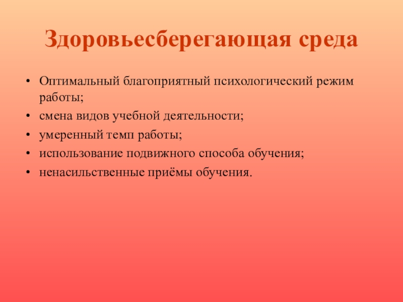 Здоровьесберегающая средаОптимальный благоприятный психологический режим работы;смена видов учебной деятельности;умеренный темп работы;использование подвижного способа обучения;ненасильственные приёмы обучения.