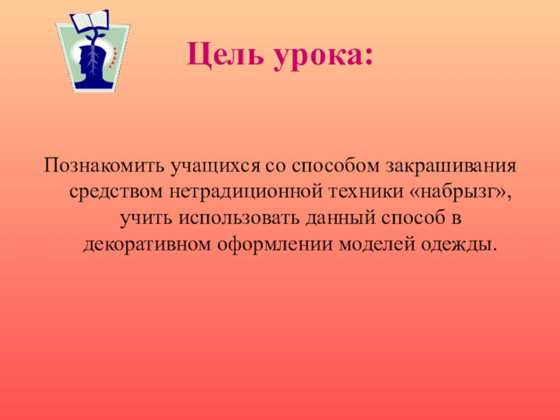 Цель урока:Познакомить учащихся со способом закрашивания средством нетрадиционной техники «набрызг», учить использовать данный способ в декоративном оформлении моделей одежды.