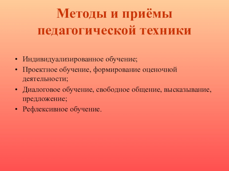 Методы и приёмы педагогической техникиИндивидуализированное обучение;Проектное обучение, формирование оценочной деятельности;Диалоговое обучение, свободное общение, высказывание, предложение;Рефлексивное обучение.