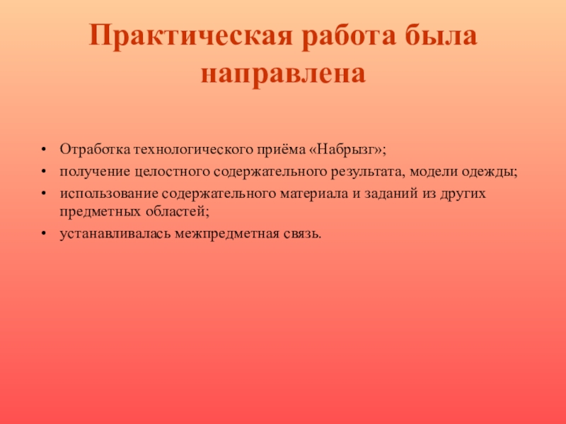 Практическая работа была направленаОтработка технологического приёма «Набрызг»;получение целостного содержательного результата, модели одежды;использование содержательного материала и заданий из