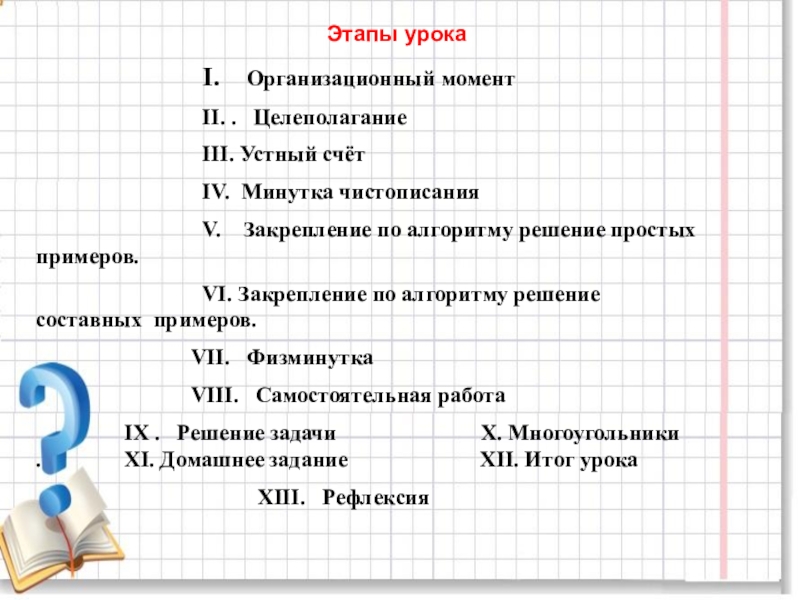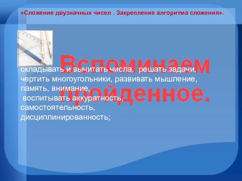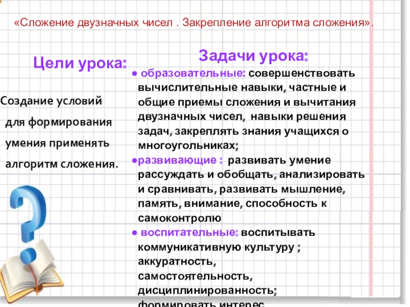 образовательные: совершенствовать вычислительные навыки, частные и общие приемы сложения и вычитания двузначных чисел, навыки решения задач, закреплять знания учащихся о многоугольниках;