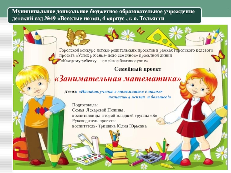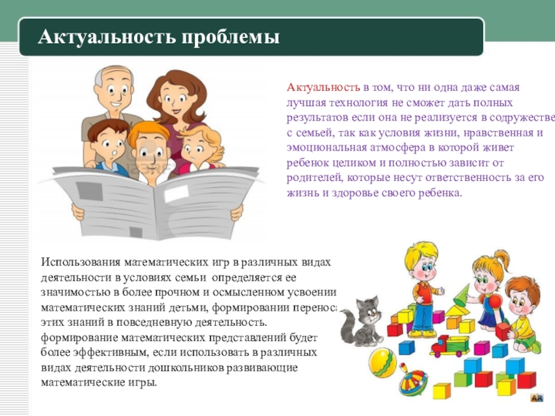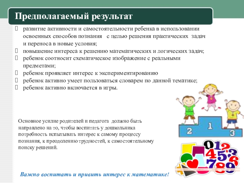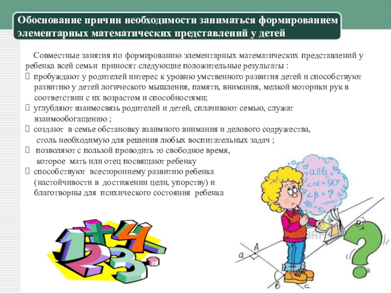 затруднения в овладении количественными знаниями. Поэтому по нашему мнению включение в совместную деятельность с ребенком в условиях семьи занимательных математических игр, задач, развлечений позволяет развить умственную деятельность, основанную на непосредственной заинтересованности нашего ребенка,