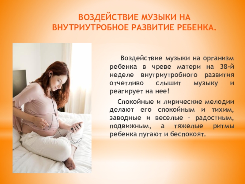 Слайд 14ВОЗДЕЙСТВИЕ МУЗЫКИ НА ВНУТРИУТРОБНОЕ РАЗВИТИЕ РЕБЕНКА.