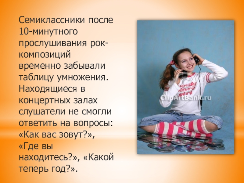 Слайд 12Семиклассники после 10-минутного прослушивания рок-композиций временно забывали таблицу умножения. Находящиеся в