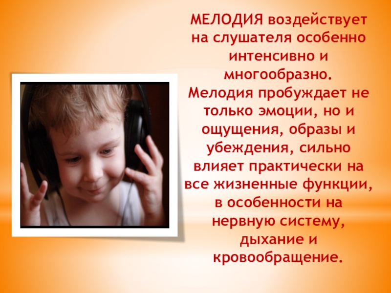 Слайд 21МЕЛОДИЯ воздействует на слушателя особенно интенсивно и многообразно.