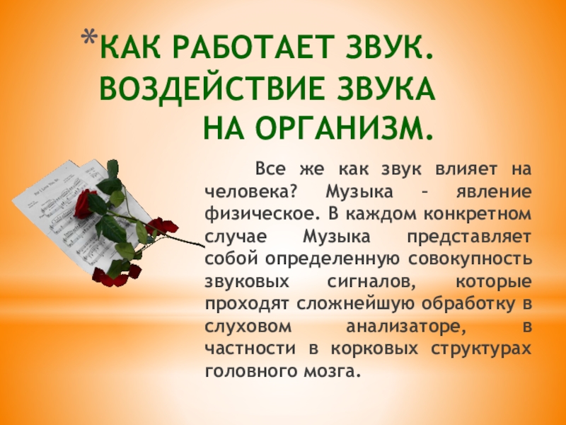 как звук влияет на человека? Музыка – явление физическое. В каждом конкретном случае Музыка представляет собой определенную совокупность звуковых сигналов, которые проходят сложнейшую обработку в слуховом анализаторе, в частности в корковых структурах головного мозга.