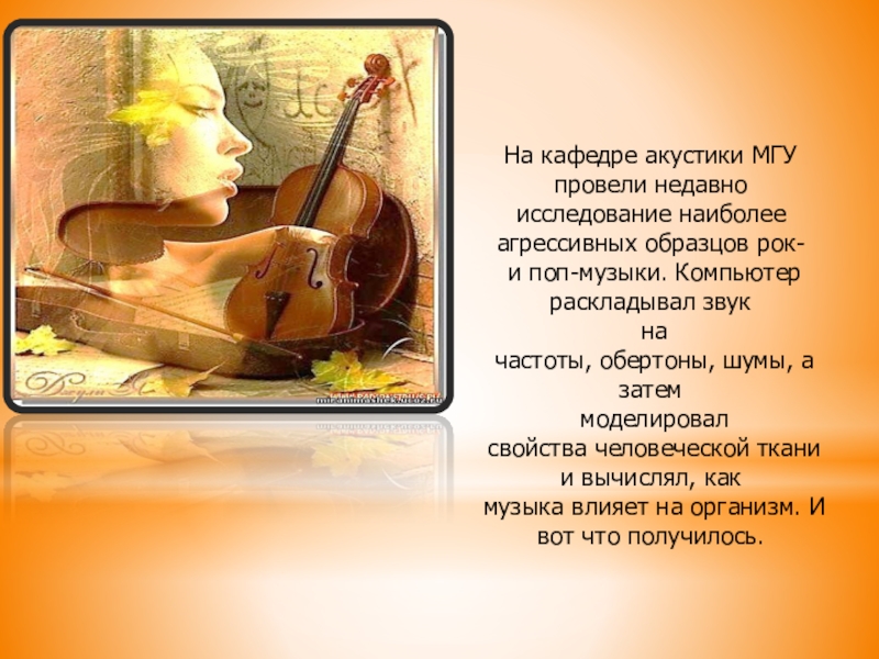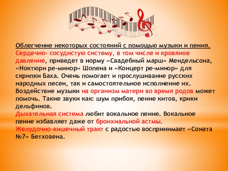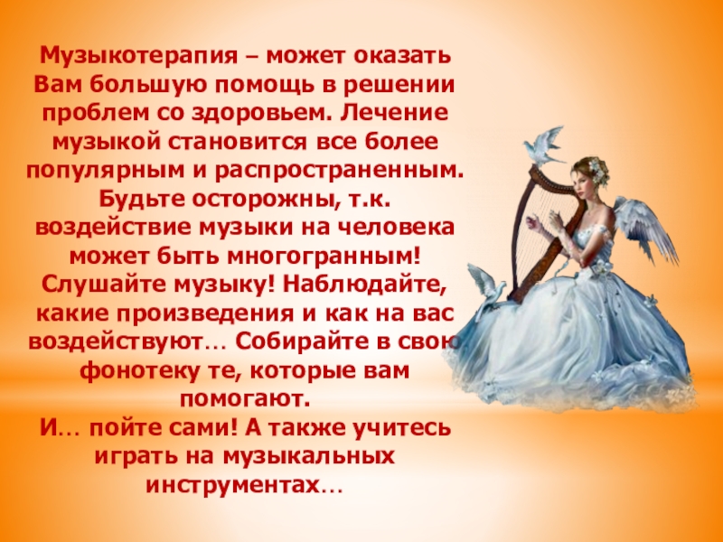 здоровьем. Лечение музыкой становится все более популярным и распространенным. Будьте осторожны, т.к. воздействие музыки на человека может быть многогранным!