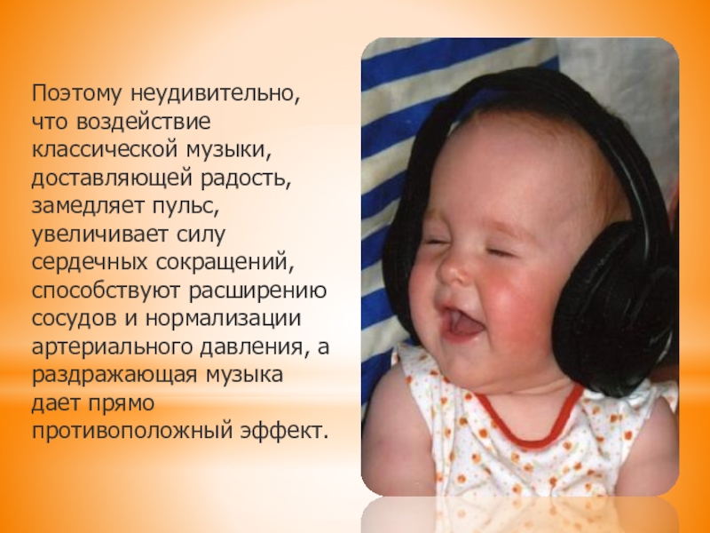 Слайд 8Поэтому неудивительно, что воздействие классической музыки, доставляющей радость, замедляет пульс, увеличивает