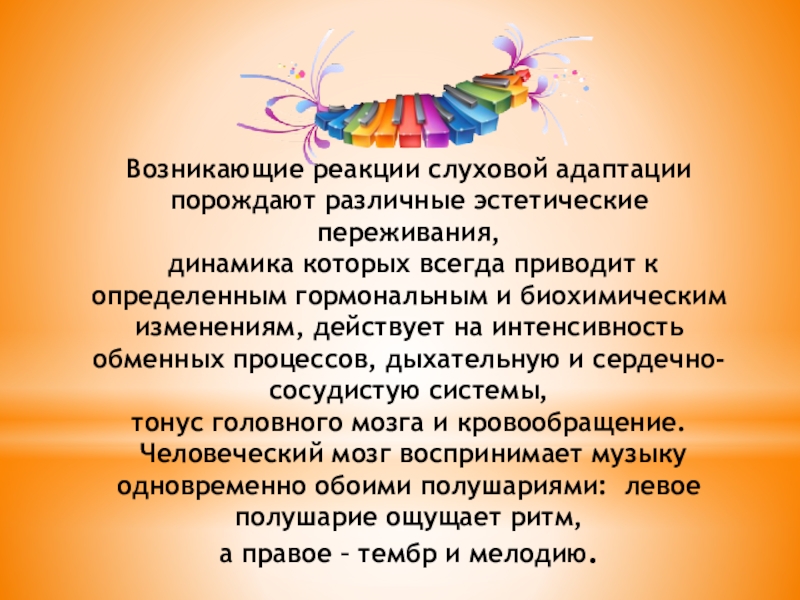 Слайд 6Возникающие реакции слуховой адаптации порождают различные эстетические переживания,