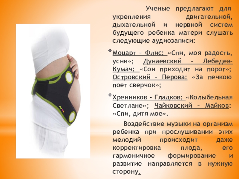 Воздействие музыки на организм ребенка при прослушивании этих мелодий происходит даже корректировка плода, его гармоничное формирование и развитие направляется в нужную сторону.