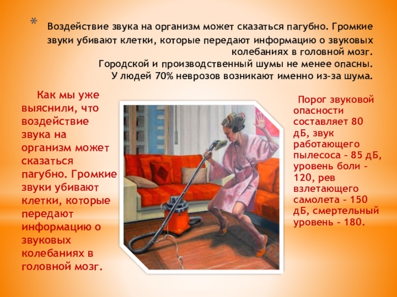 Слайд 9 Воздействие звука на организм может сказаться пагубно. Громкие звуки убивают