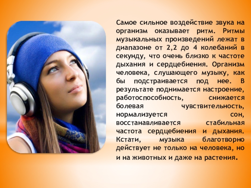 лежат в диапазоне от 2,2 до 4 колебаний в секунду, что очень близко к частоте дыхания и сердцебиения. Организм человека, слушающего музыку, как бы подстраивается под нее. В результате поднимается настроение, работоспособность, снижается болевая чувствительность, нормализуется сон, восстанавливается стабильная частота сердцебиения и дыхания. Кстати, музыка благотворно действует не только на человека, но и на животных и даже на растения.