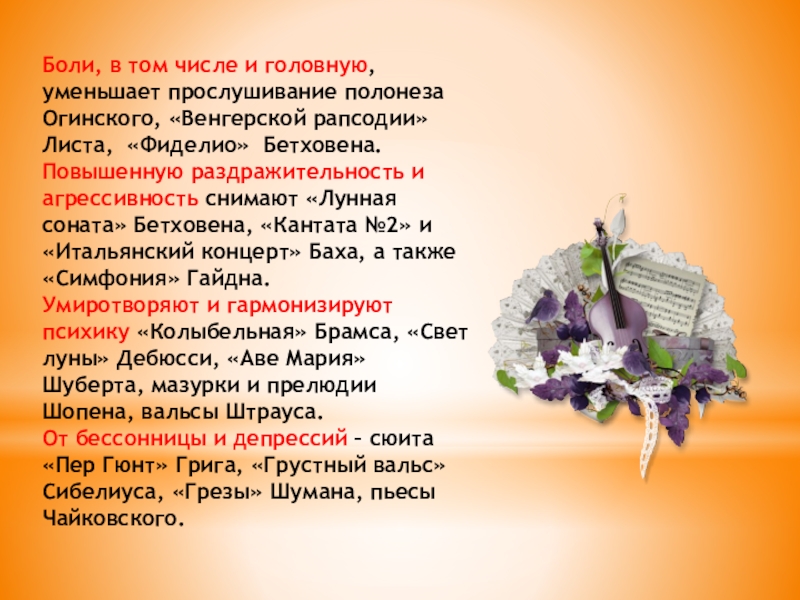 Умиротворяют и гармонизируют психику «Колыбельная» Брамса, «Свет луны» Дебюсси, «Аве Мария» Шуберта, мазурки и прелюдии Шопена, вальсы Штрауса.