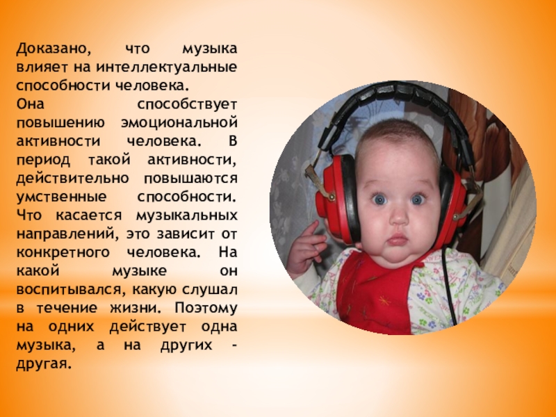 Слайд 16Доказано, что музыка влияет на интеллектуальные способности человека.