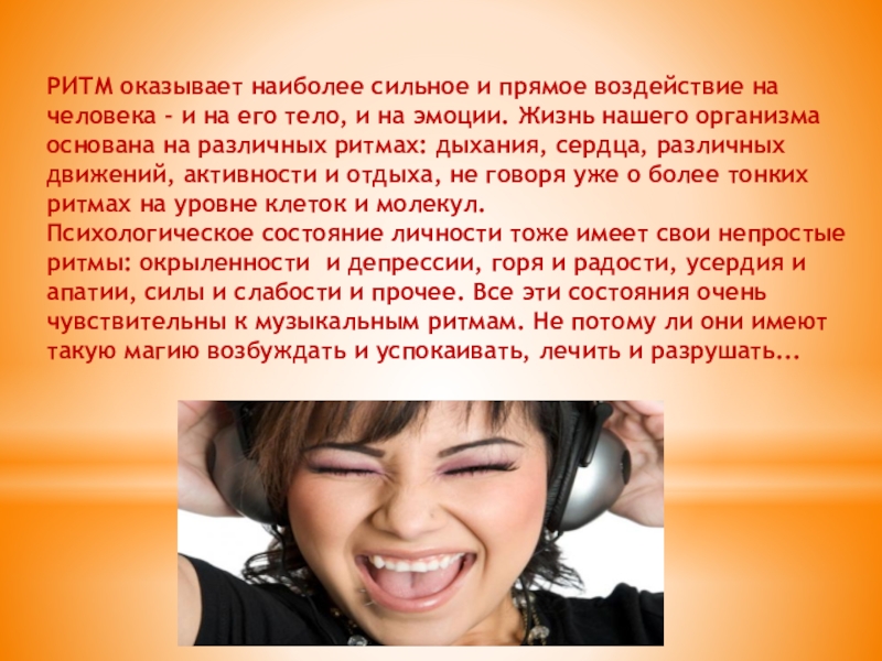 Слайд 20РИТМ оказывает наиболее сильное и прямое воздействие на человека - и
