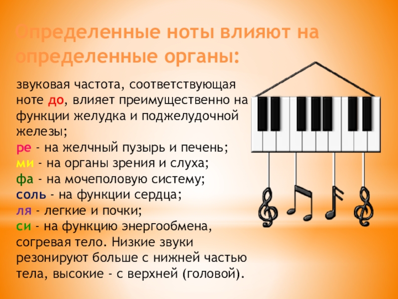 Слайд 24звуковая частота, соответствующая ноте до, влияет преимущественно на функции желудка и поджелудочной
