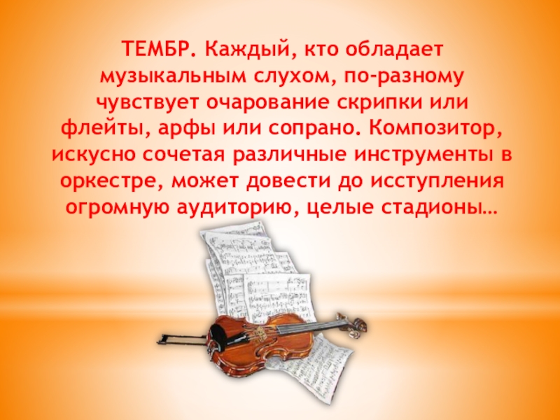 Слайд 23ТЕМБР. Каждый, кто обладает музыкальным слухом, по-разному чувствует очарование скрипки или