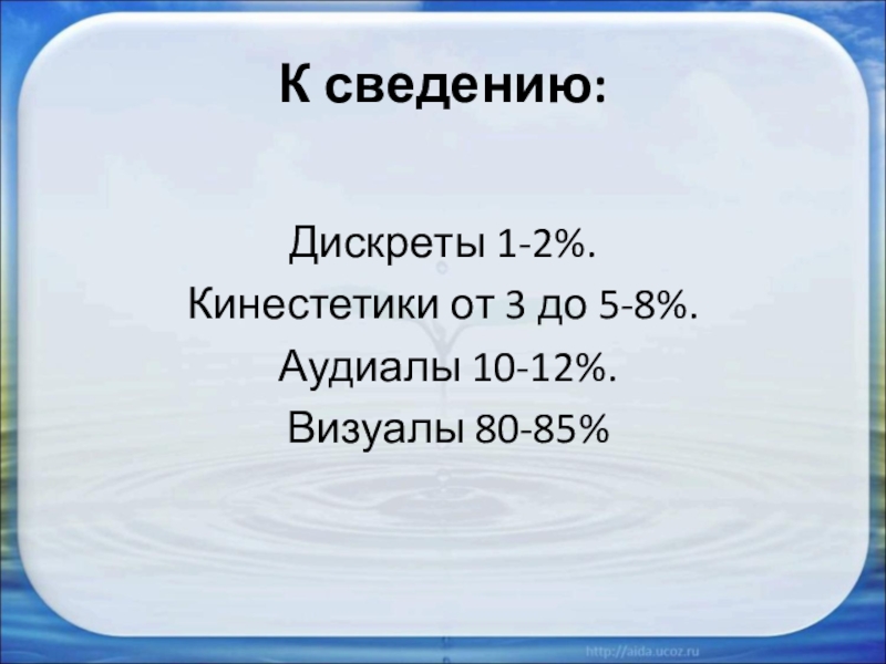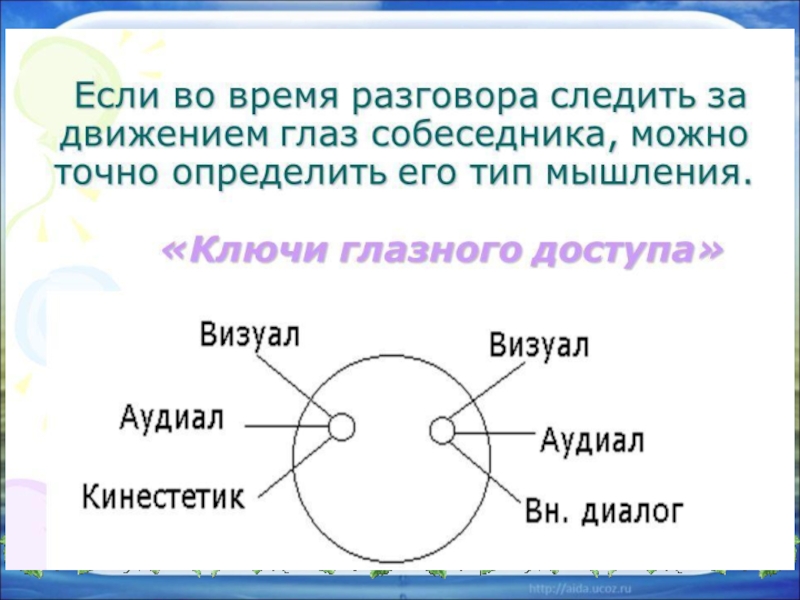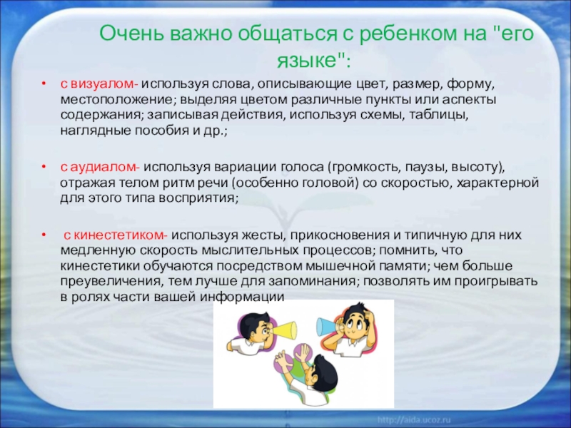с аудиалом- используя вариации голоса (громкость, паузы, высоту), отражая телом ритм речи (особенно головой) со скоростью, характерной для этого типа восприятия;