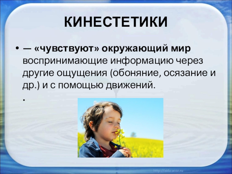 Кинестетика - не заставлять сидеть долгое время неподвижно; обязательно давать ему возможность моторной разрядки (сходить за карандашом, листом, писать на доске, дома - сходить в другую комнату и т.д.); запоминание материала у него легче происходит во время движения.