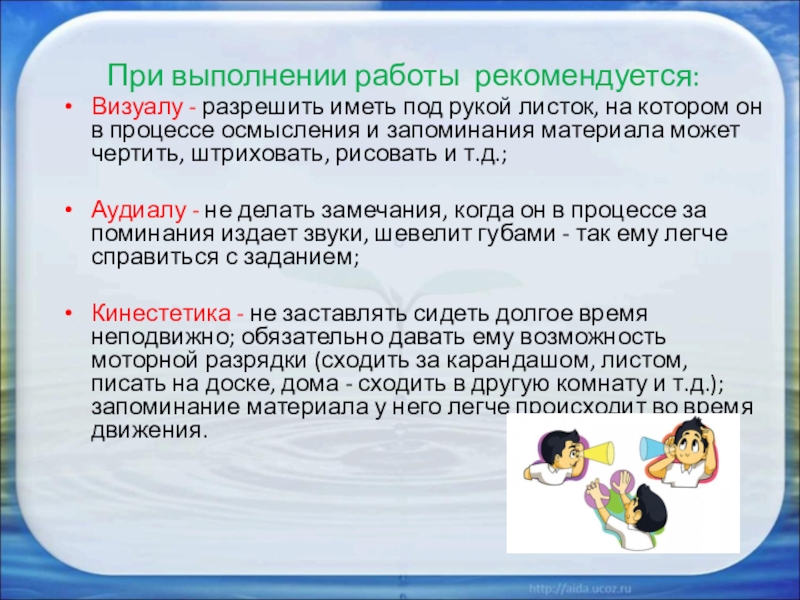 Аудиалу - не делать замечания, когда он в процессе за поминания издает звуки, шевелит губами - так ему легче справиться с заданием;