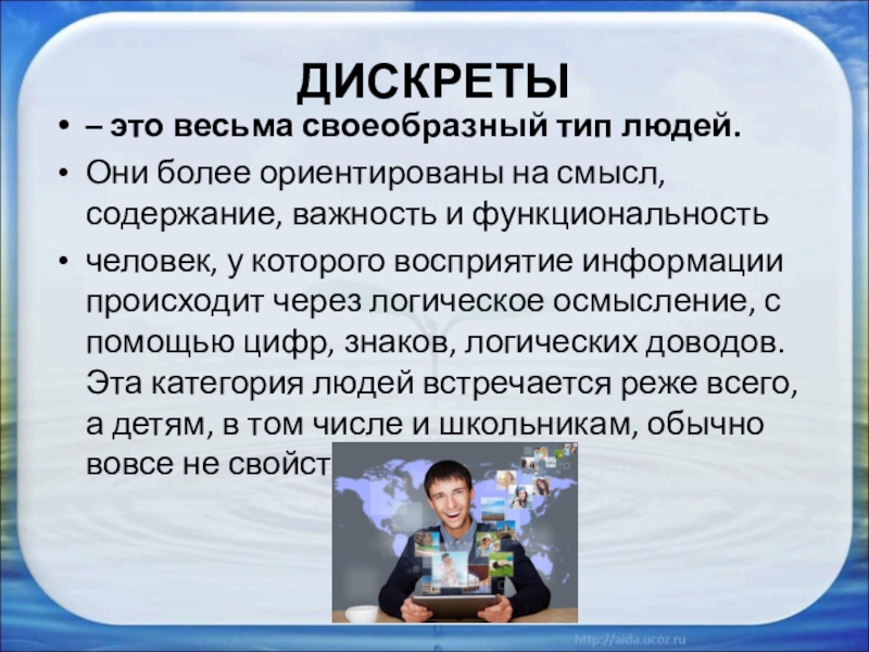 человек, у которого восприятие информации происходит через логическое осмысление, с помощью цифр, знаков, логических доводов. Эта категория людей встречается реже всего, а детям, в том числе и школьникам, обычно вовсе не свойственна.
