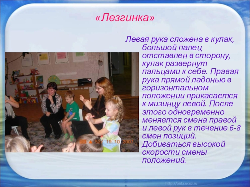 развернут пальцами к себе. Правая рука прямой ладонью в горизонтальном положении прикасается к мизинцу левой. После этого одновременно меняется смена правой и левой рук в течение 6-8 смен позиций. Добиваться высокой скорости смены положений.