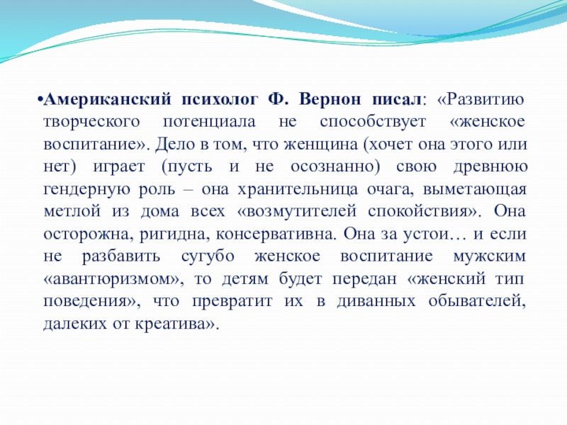 Слайд 9Американский психолог Ф. Вернон писал: «Развитию творческого потенциала не способствует «женское